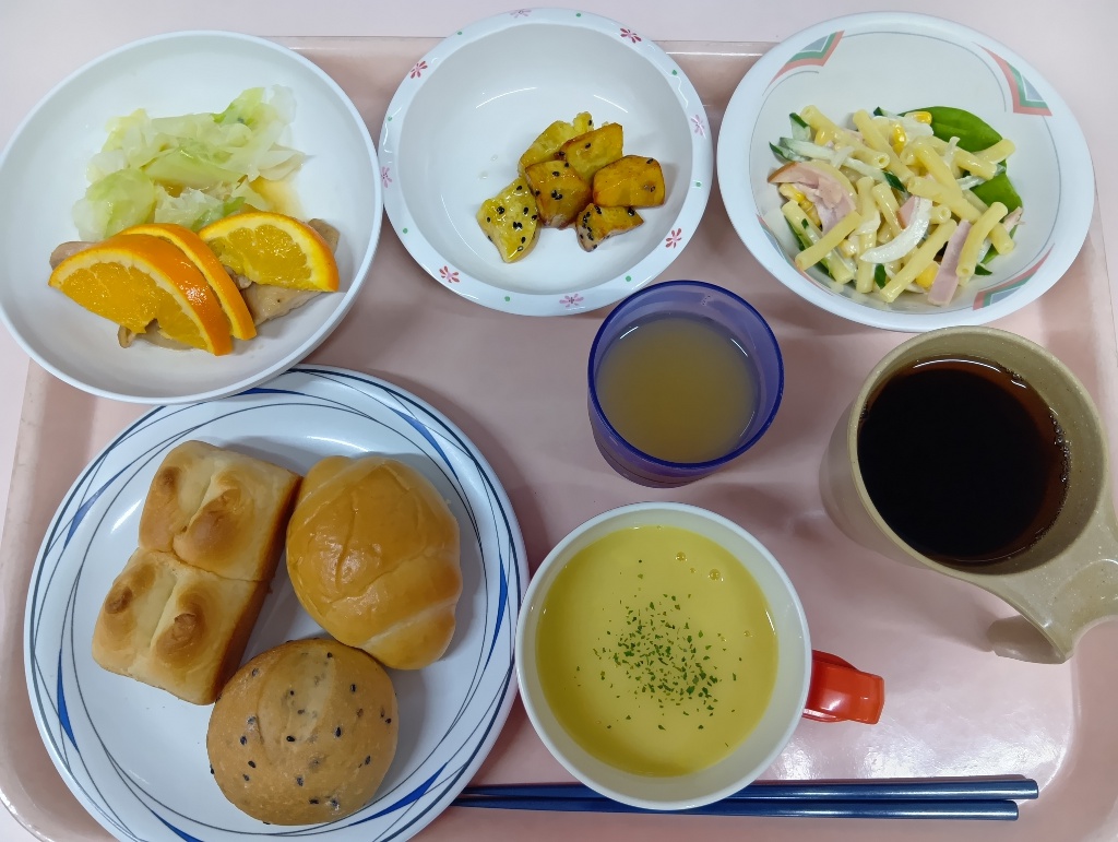 2025年9月「お酢の効果・効能」(パンの盛り合わせ、コーンスープ、鶏のオレンジさっぱり煮、マカロニサラダ、大学芋、リフレッシュジュース)