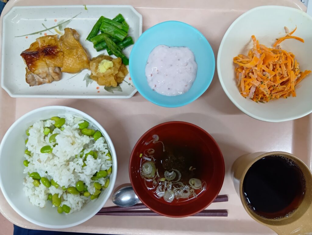 2025年8月「野菜を食べよう」(枝豆ごはん、すまし汁(とろろ昆布・長葱)、鶏肉の照り焼き(大根おろし・アスパラ添え)、無限人参マヨサラダ、フルーチェ)