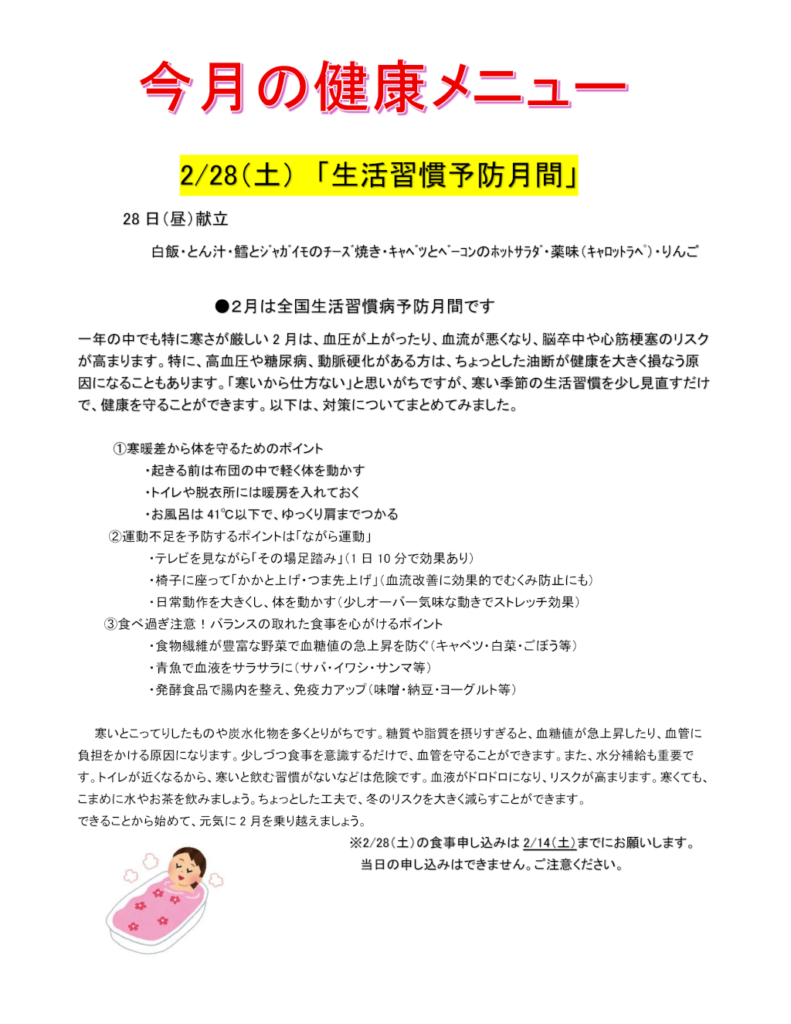 今月の健康メニューのご紹介(毎月1食、施設栄養士が推薦する昼食メニューを「今月の健康メニュー」と称して、職員に無償で提供しています。) ※過去の健康メニューはこちら