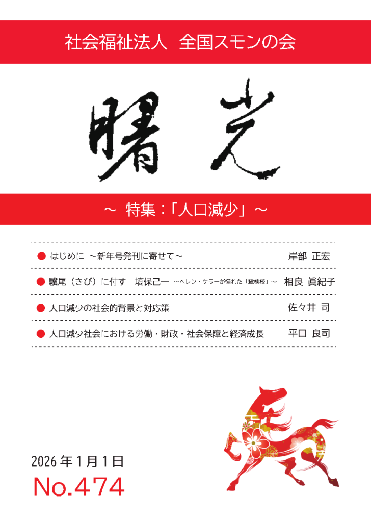定期刊行物「曙光」474号を発行いたしました 2026 1/14 未分類 2026年1月14日 定期刊行物「曙光」通巻474号(2026年1月1日号、特集「人口減少」)を発行いたしました。当初発行予定より大幅に遅れての発行となりましたことをお詫び申し上げます。 未分類
